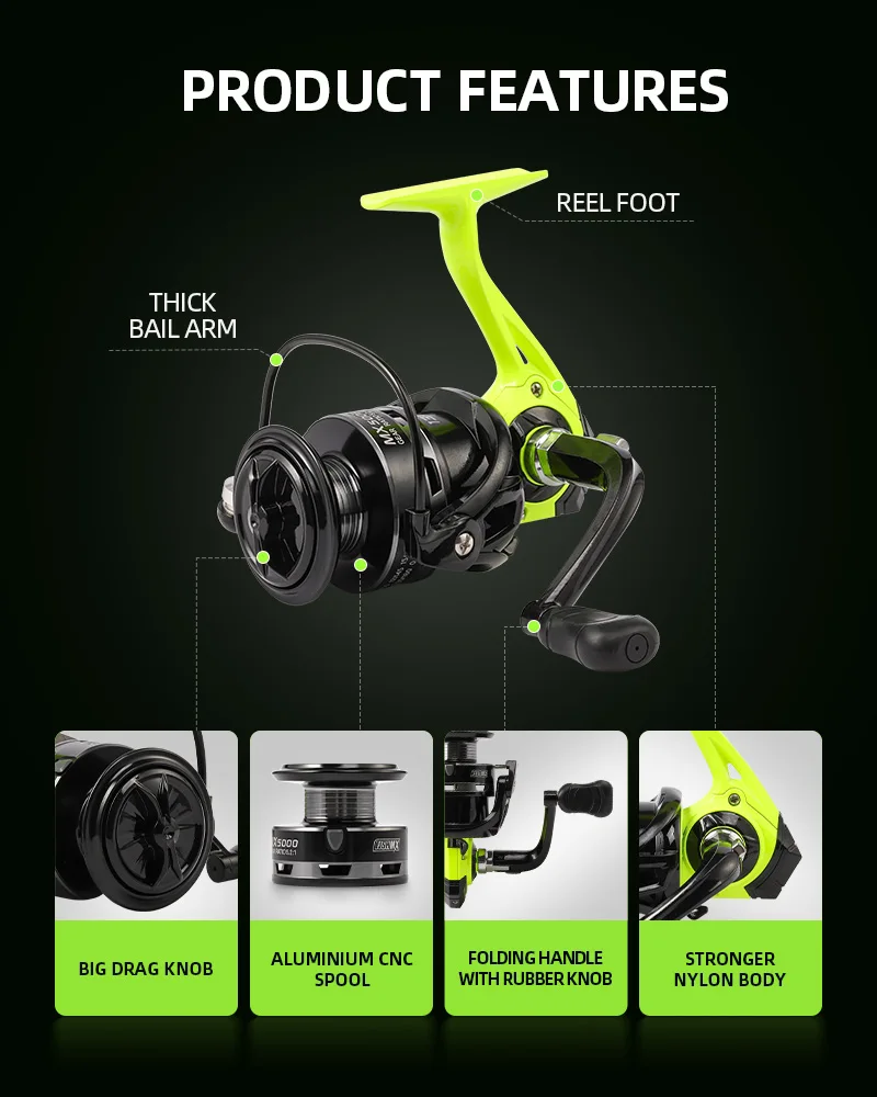 • Pre-Loading Spinning Wheel: The pre-loading spinning wheel design allows for smooth and easy casting, reducing the risk of tangles and knots in the fishing line.
